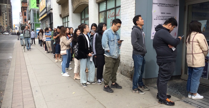 А это другой пример очереди, мелкой, но примечательной тем, что стоят одни азиаты в некое заведение, которое недавно открылось и, наверное, это какой-то известный азиатский бренд.