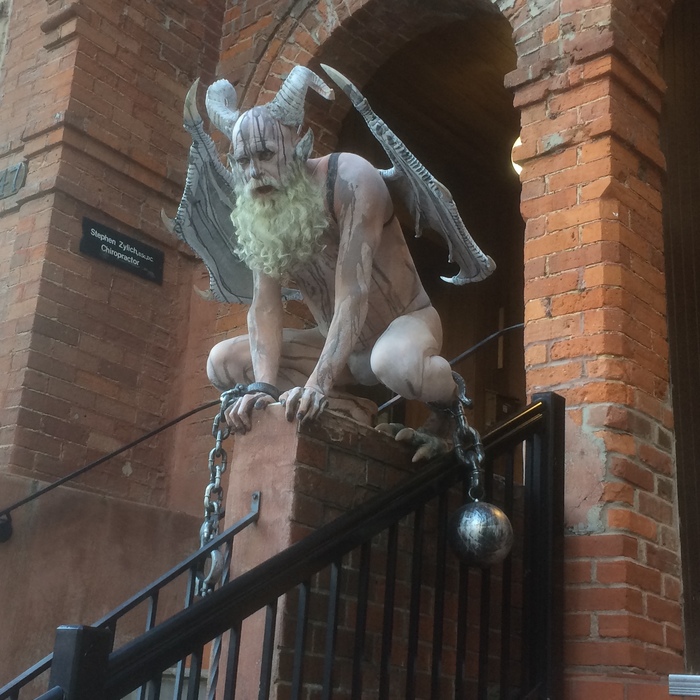 У мужика костюм прикольный. Это после гей-парада на соседних улицах. С ним детишки радостно фотались.