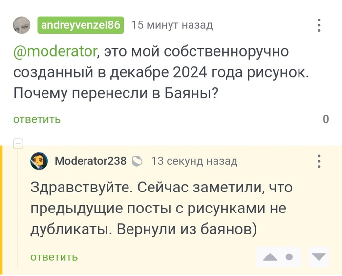Ситуация комичная. Нытик пожаловался, не глядя, ибо привык жаловаться, не думая, на автомате. Модератор перенёс, поверив нытику на слово, мой личный недавний рисунок в Баяны.