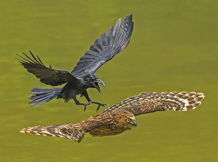 Вот этим вороны и занимаются, приземляясь на спину своим врагам. Они преследуют хищников, седлают их против воли, клюют и рвут перья во время этого родео из шеи, оттуда куда не может дотянуться хищный птах.