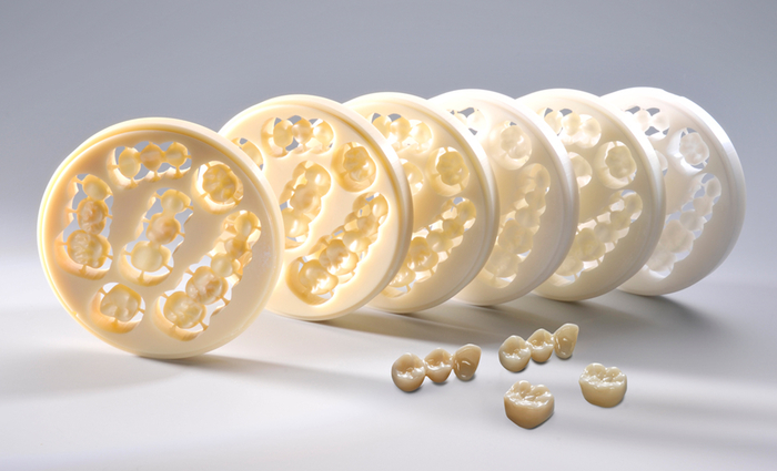 Такая коронка моделируется в «цифре» — то есть в специальных программах по скану слепка или непосредственно по данным, полученным во рту, — а потом фрезеруется на ЧПУ‑станке из специального блока. Затем обжигается в специальной печи.