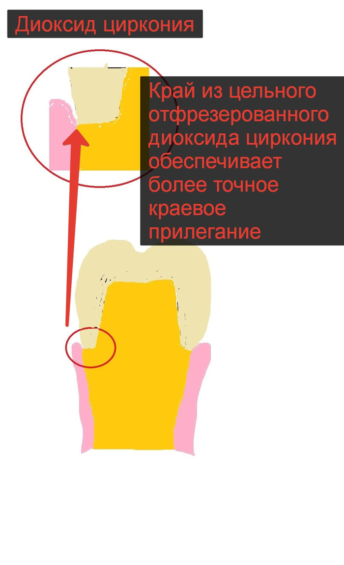 Если край у коронки, который соприкасается с тканями зуба, сделан из одного материала, который был отфрезерован или отлит, то точность гораздо выше. Вот пример с диоксидом циркония.