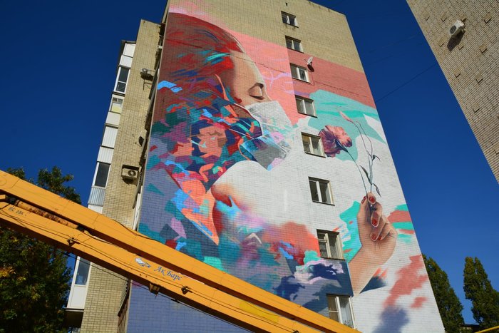 В Саратове художник Юрий Быков закончил работу над граффити, которое посвящено труду медицинских работников.