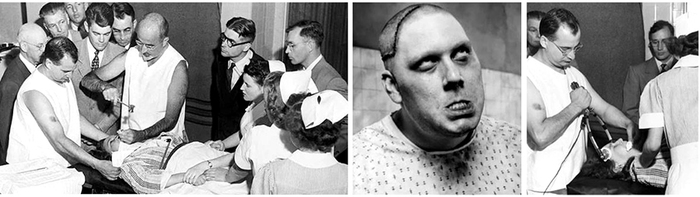 Но врачи не только пичкали своих пациентов, на протяжении столетий, сомнительными «снадобьями», «пускали кровь» и ставили клизмы. Некоторые медики пробовали свои способности и иным, более радикальным способом. Например, ещё с доисторических времён известны попытки лечить головную боль или сумасшествие при помощи трепанации черепа – проще говоря, пациенту сверлили голову, надеясь таким образом его вылечить (выпустить «демонов»). В середине ХХ века учёные пересмотрели древние методы и пошли дальше – популярность получила жуткая процедура, называвшаяся лоботомией – когда человеку через глазную впадину, пробив её, вводили в мозг зонд, которым рассекали лобные доли. Считалось, что подобная операция может нормализовать поведение пациента. За это ужасное «открытие» в 1949 году португалец Эгаш Мониш получил даже Нобелевскую премию.