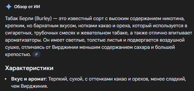 Вывод - это чисто берли с его крепостью и вкусом, которую мы и ожидаем увидеть в этом сорте табака. Что бы не вводить вас в заблуждение, и не вызывать дискуссии по вкусам, вот что думает ИИ...)))