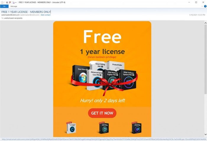 В письмах содержалась гиперссылка «GET IT NOW», перенаправляющая пользователей по адресу hxxps://forums.iobit.com/promo.html. Сейчас URL «обезврежен», однако ещё недавно он подсовывал участникам сообщества IObit архив — hxxps://forums.iobit.com/free-iobit-license-promo.zip.