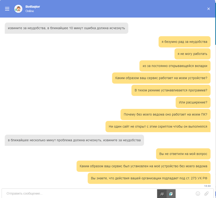Из всего этого делаем вывод. Что каким-то неизвестным образом на мое устройство без моего ведома было установлено вредоносное ПО с неизвестной для меня целью и оно, видимо, дало сбой. А "несчастная" техподдержка пытается занести мой ip в черный список.