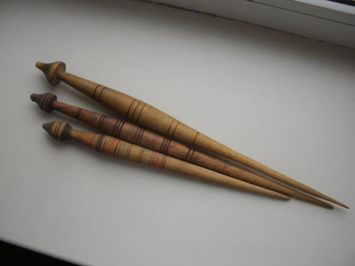 Здесь не видно веретена. Вот как они выглядят. У бабушки были такие же - с украшениями, не гладкие: