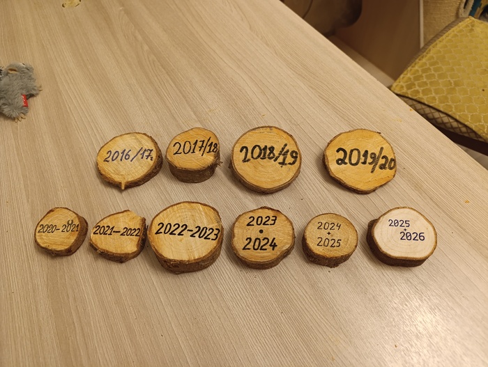 У нашей семьи, помимо оливье и селëдки под шубой, есть одна интересная новогодняя традиция: каждый Новый год делать "спил" с очередной ëлки и писать на нëм, какие годы сменяются, чтобы потом положить в специальную коробочку на память) Делаем так с 2016/2017 года, а сегодня накопилось уже 10 спилов! С Новым годом всех! 🐎🐎🐎🎄🎄🎄
