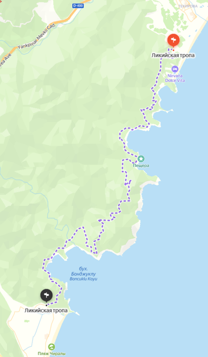 На долмуше ТА08 едем до конца Текирова. На схеме показана часть маршрута долмуша от Кемера до Текирова. Идет он из Антальи через Белдиби/Гойнюк/Чамьюва (см раздел Транспорт) Водитель знает, где в Текирова начинается Ликийская тропа, надо только правильно ему сказать волшебные слова: По турецки «Ликиа Йолу» (пишется Likya Yolu) По английски «Лисиан Вэй» (пишется Lycian Way)