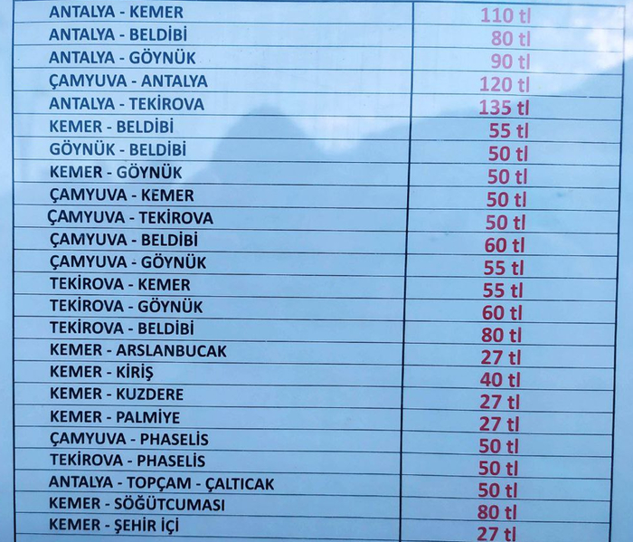 В долмушах платим лирами или мелкими долларами/евро. Над головой у водителя прайс
