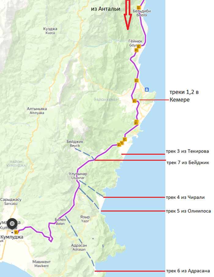 Внимание! Есть другой маршрут Анталья-Кумлуджа, который идет через горы и пос. Алтыньяка. Нам он, разумеется, не подходит АК03 довезет до треков 4,5,6,7, от остановок на трассе там надо немного подъехать на местном долмуше (пунктиры на схеме) Подробнее в описании каждого трека.