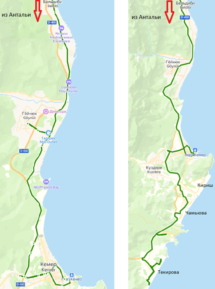 Транспорт на побережье хорошо развит, из любого отеля можно доехать к началу трека. Здесь мы приводим общие схемы, при этом на месте Я-карты позволяют видеть маршруты долмушей интерактивно.