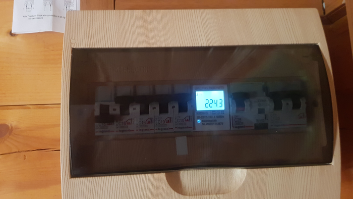 Чуть позже щиток немного доработал - убрал два лишних автомата, а вместо них поставил полезную приблуду (с того же сайта), 4-в-одном: вольтаж (V), ток (I), мощность (P) и счётчик (kW). Теперь счётчик выглядит вот так:
