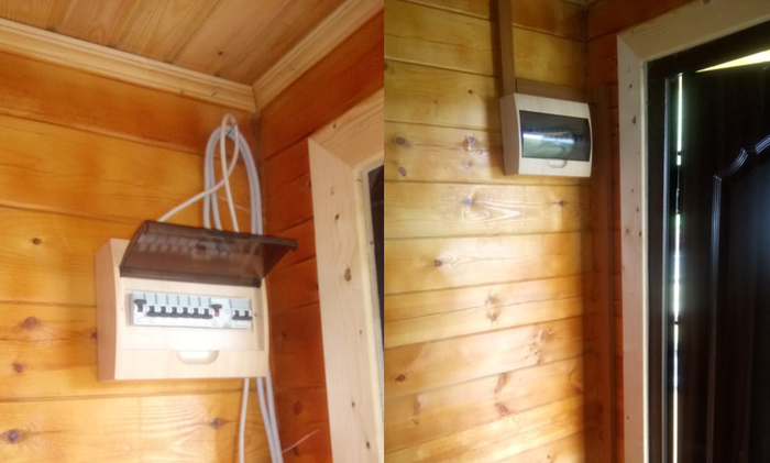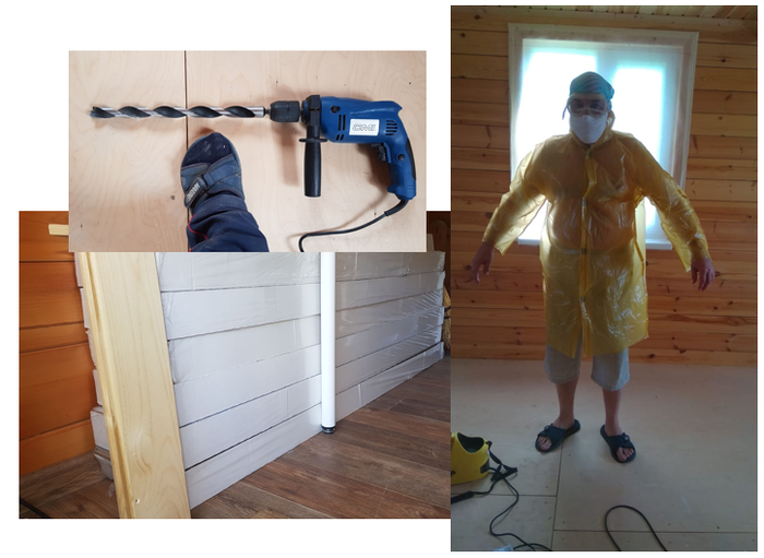 Ранней весной (благо - было тепло) мы начали работы в доме. Первым делом я покрыл стены экопропиткой на основе воска и кедрового масла (отечественная, кстати - и без запаха!) с помощью свеже-приобретённого краскопульта. Очень нудное занятие, я вам доложу... но без этого - никуда. Затем завёл в дом электрокабель, собрал щиток, проложил кабель-каналы и уложил туда провода.