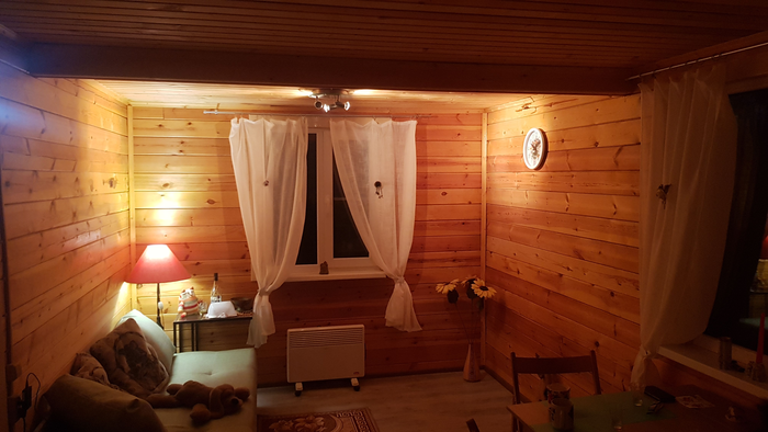 А потом нас ждали 6 упаковок ламината, и 12 метров плинтусов, и 25 метров кабеля (дрель с гигантским сверлом на фото - для прохода через брус), и 6 розеток, и 2 выключателя, и два потолочных светильника, и шторы, и... покупка дивана и стола... Всё для того, чтобы теперь вечерами мы могли насладиться тишиной и спокойствием вот в такой уютной комнате: