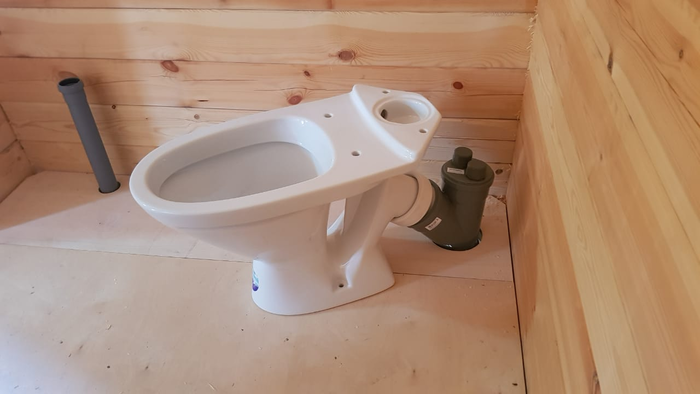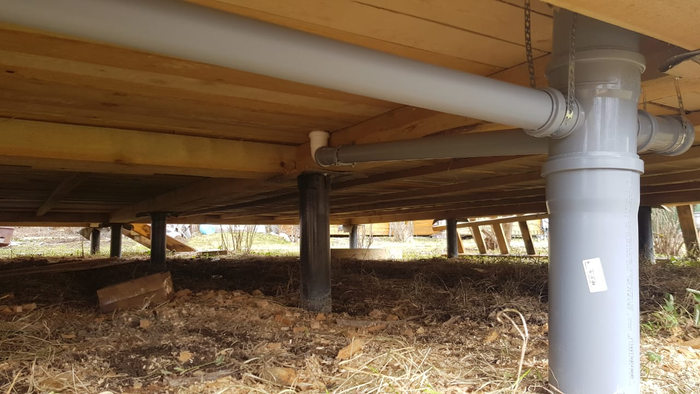 Рано или поздно надо было заниматься водой и канализацией. Начал с последней. В туалете пришлось снимать чистовой пол, чтобы пройти отверстия для труб, ползать под домом - тоже понравилось (нет)... но в конце концов получилось вот что: (внутри и снаружи)