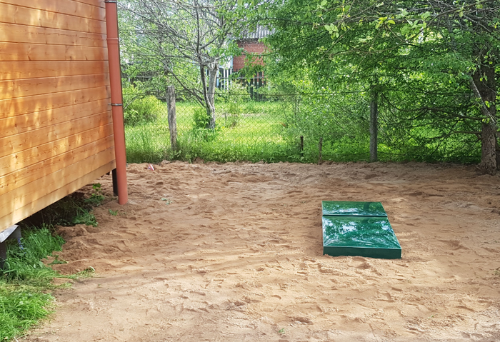 ...Но вся эта красота не имеет никакого смысла, пока не установлен СЕПТИК. Это была отдельная и грустная, и радостная песня, затянувшаяся аж на три недели. Были деньги, нервы, снова деньги и снова нервы. Но и у этой сказки оказался счастливый конец - септик был установлен и подключен ко всем коммуникациям! (Понятно, что септик устанавливался силами компании-производителя, это делал не я.) Песочком присыпана 3 куба глины, изъятой из котлована и разнесённой вокруг септика. Сейчас там уже пробивается травка.