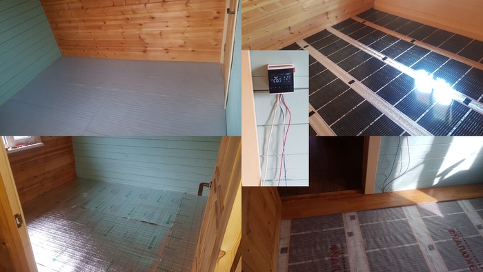 Затем настал черёд тёплого пола. В одиночку это делать очень неудобно. В одной комнате мне помогала жена, в другой - сын. Всего на укладку/монтаж/ламинат уходит примерно день с перерывом на обед и отдых. Заодно освоил укладку ламината.