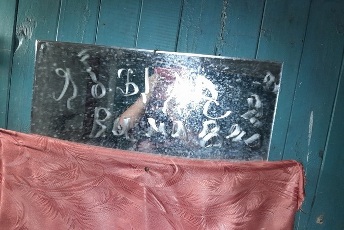 © Неразборчивая надпись, сделанная мылом на зеркале. Фото предоставлено Виктором Фефеловым.