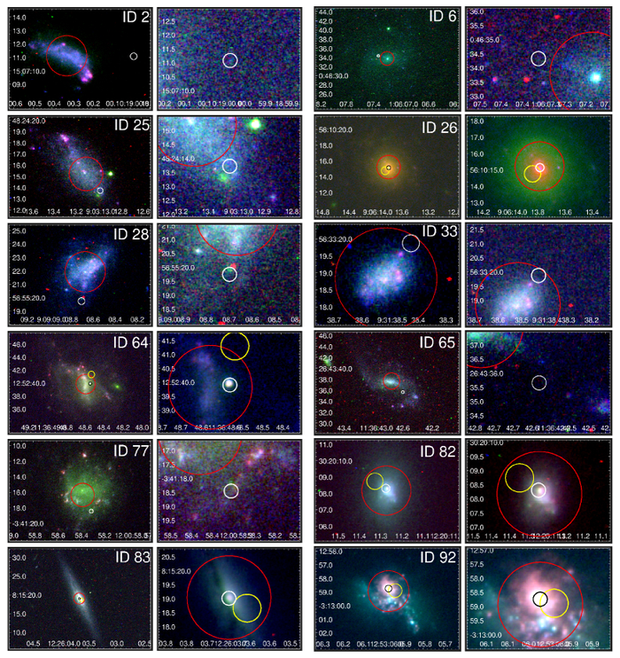 Трехцветные изображения, полученные с помощью космического телескопа Хаббл, показывают, что компактные радиоисточники (обозначены белыми/черными окружностями радиусом 0.′′25) и рентгеновские источники (желтые окружности радиусом 0.′′5) примерно совпадают по положению в галактиках IDs 26, 64, 82, 83 и 92, при этом волокна SDSS (красные окружности диаметром 3.′′0) также расположены вблизи этих источников.