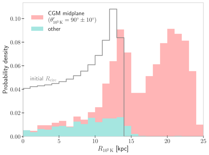 Анализ распределения радиусов, на которых происходит охлаждение горячего газа от ≈10⁶ K до ≈10⁴ K при угле наклона в 30 градусов, показывает, что почти весь газ, охлаждающийся за пределами 4Rd = 10 кпк, охлаждается в плоскости CGM, а не дальше в гало или в плоскости наклоненного звездного диска, что подтверждается цветовой кодировкой данных.