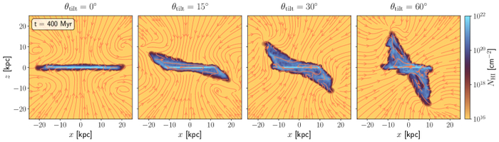 Моделирование формирования Hiwarp из вращающегося горячего CGM с различными углами наклона демонстрирует, что охлаждение горячего потока в плоскости наклоненного CGM приводит к образованию Hiwarp при ненулевых углах наклона, что подтверждается красными линиями, отображающими поле скоростей.