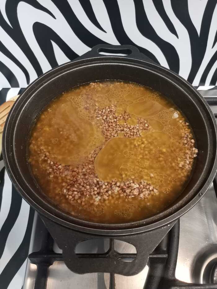 Для начала варим гречку удобным вам способом. Нам понадобится примерно полстакана гречки. Но сварить полстакана гречки лично мне не очень удобно, поэтому я сварю стакан и оставшуюся использую куда-то ещё. А можно увеличить количество всех остальных ингредиентов в два раза и использовать всю гречку.