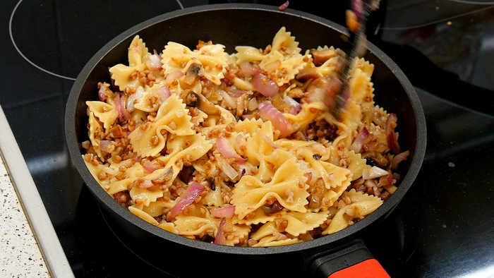 У вас могут быть совсем другие предпочтения. Может быть, вам нравятся тушёные грибы и лук, но при этом зажаренные макароны и гречка. Тогда просто измените на свой вкус порядок закладывания продуктов в сковороду.