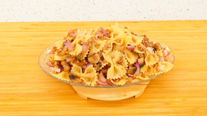 Огонь я выключила потому, что я в данном случае не хочу, чтобы макароны с гречкой даже чуть-чуть обжарились. Это дело вкуса. Нам нравится именно так: грибы зажарены сильно, лук почти свежий, а макароны с гречкой варёные.