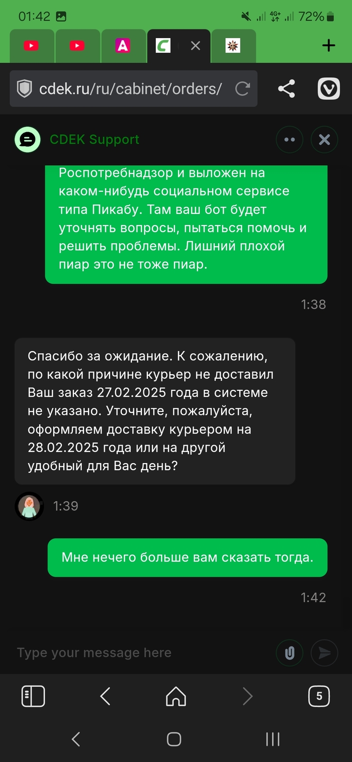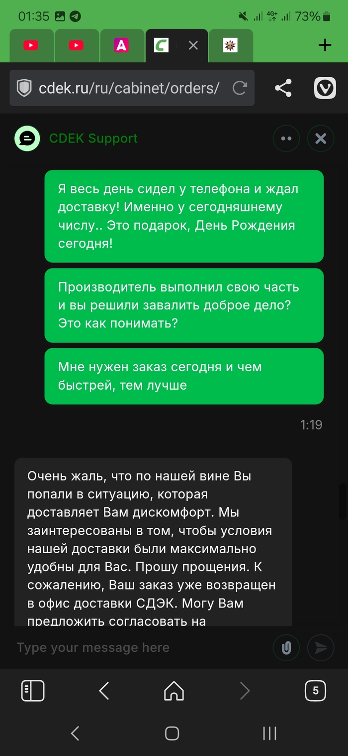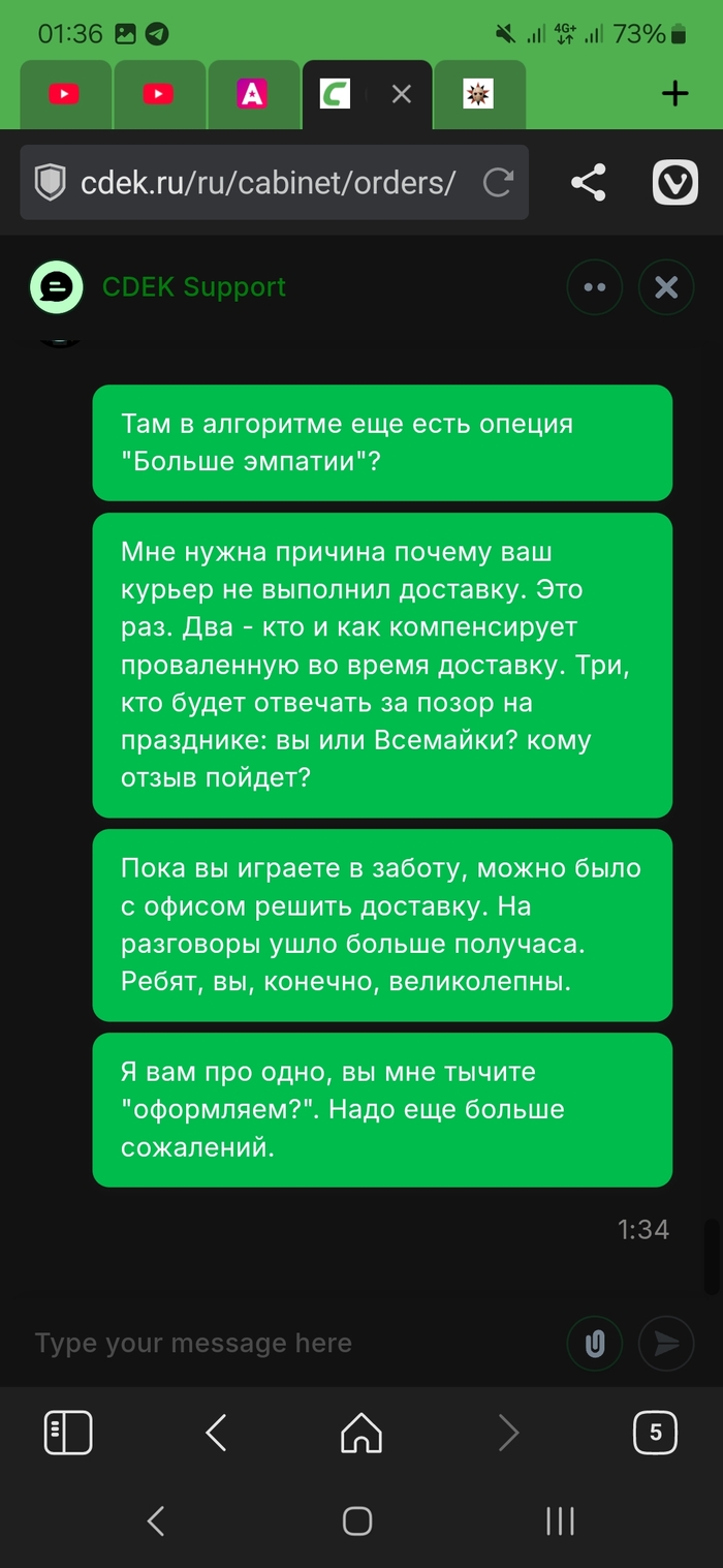 Заказал товарищу на День Варенья подарок на всехмайках (не реклама) к конкретной дате. Майки всё выполнили в срок, передали сдэку (да, с маленькой). Эти уроды сегодня выдали заказ курьеру и я день провел около телефона, потому что этот гнила за час должен перезвонить. В 17 часов я уже нервничал и полез в их чат. Мне сообщили, что гнида нишмагла по непонятной причине (в "системе" у них там не указано) и товари возвращен в их местный офис. А везти его мне повторно и выполнять обязательства никто не собирается. Наверное, рабочий день закончился у переработавших. В разговоре эта эмпатичная Диночка по заветам алгоритмов расставалась усеять сожалениями и пожалейкой (до обниманий и симпафок не дошло). На резонное предложение выполнить обязательства в срок повторяла перенести доставку на следующий день.