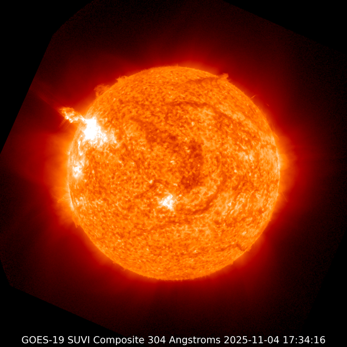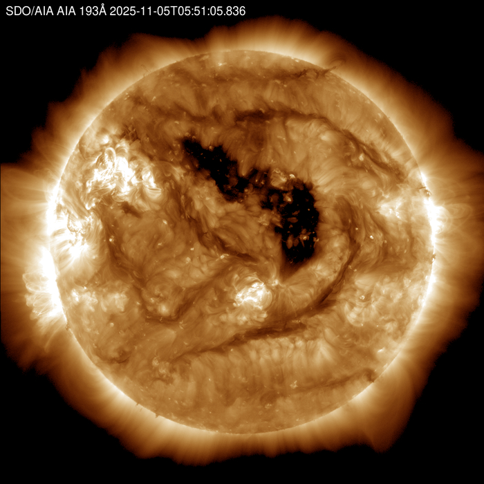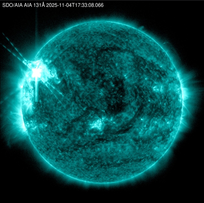 Вспышка сопровождалась выбросом корональных масс. Согласно первоначальным моделям, выброс может задеть Землю самым краем вечером 6 ноября с уровнем геомагнитных возмущений Кр7... Кр9 (магнитная буря G3(сильная) — G4 (очень сильная)). На мой взгляд - слишком оптимистичный прогноз. Источник вспышки находится слишком далеко от линии Земля-Солнце, поэтому выброс направлен в основном в сторону от Земли, и поэтому вероятный индекс Кр вряд ли превысит 6 (G2, умеренная геомагнитная буря) из-за касательного попадания, если оно вообще будет.