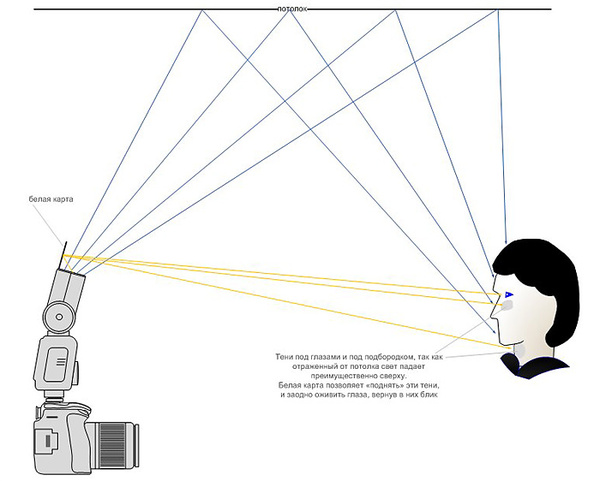 Направляем вспышку вверх в потолок, или чуть под меньшим углом, достаем "карту" они встроены почти во все вспышки сейчас