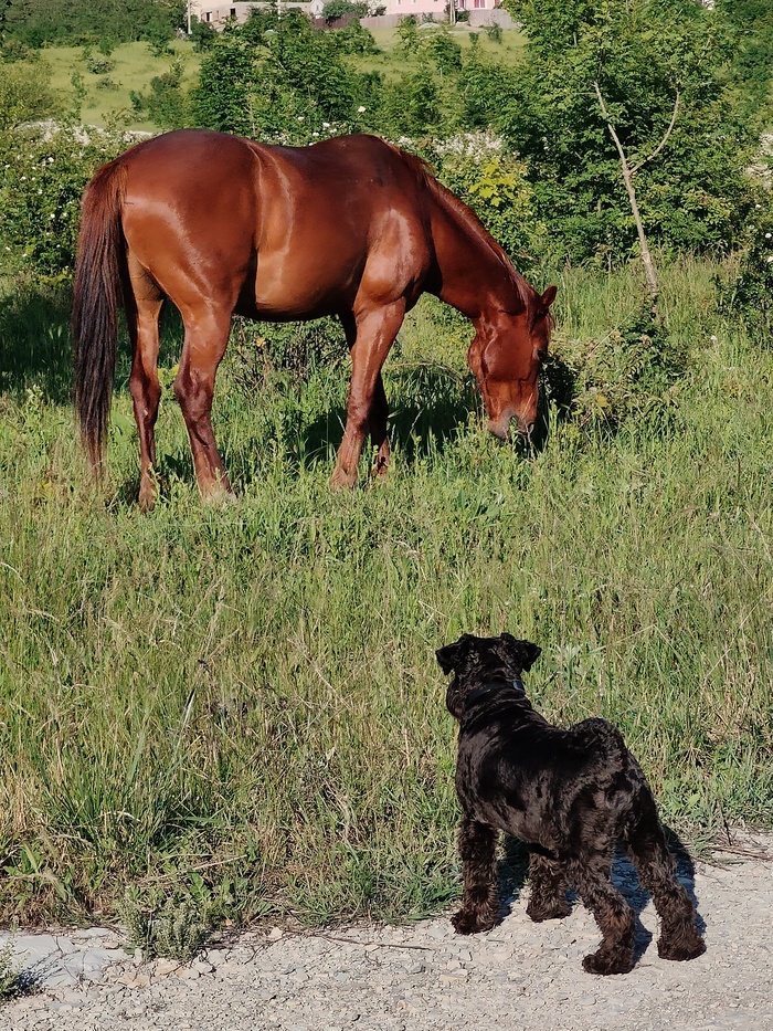 Гуляла сегодня поутру с собакой вдоль реки в окрестностях маминой дачи, пока ждала мужа с гемодиализа. Там на лужайке конь щипал травку и вдруг заинтересовался нами! Напугал и насмешил, шёл за нами долго.