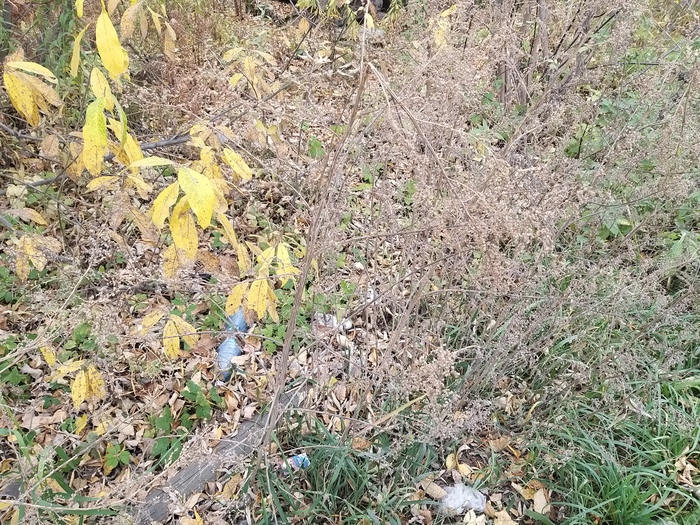 Но уже по подъезжая к курьерской службе я понял, что в одном месте мои ожидания не будут обмануты. Дело в том, что там, возле жилого дома, есть пустырь. Не заброшенное строительство, а просто клочок земли, который быстро превратился в "народный парк выгула и срезания дороги". И вот стоило мне спустится по тропинке, как я буквально оказался в окружении мусора.