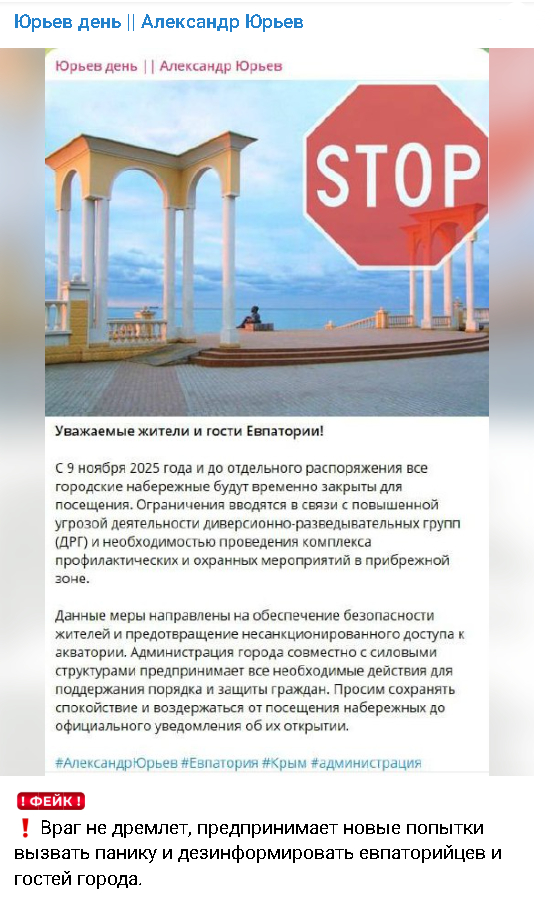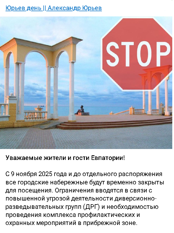 Глава администрации Евпатории в своем тг-канале якобы предупреждает жителей, что с 9 ноября городские набережные будут закрыты для посещения в связи с повышенной угрозой деятельности ДРГ.