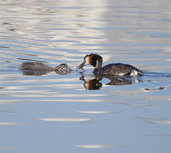 Чомги или большие поганки – это водоплавающие птицы из отряда поганкообразных. Отличительная черта в летнее время - цветные перья на голове в виде своеобразных «рожек». Характерной чертой внешнего вида чомги является и особый «воротник» на шее каштаново-рыжего оттенка. Занесены в Красную книгу Москвы под 2-й категорией.