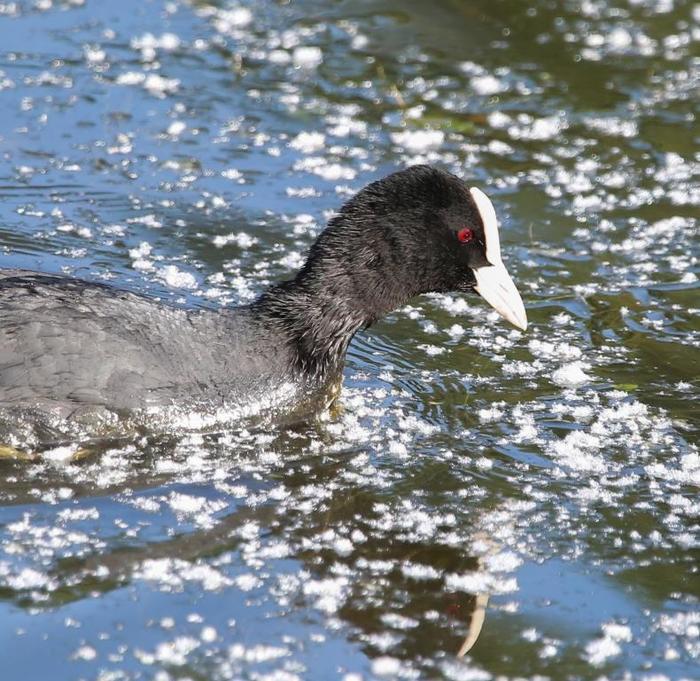 Лысухи – самые редкие из представителей Красной книги города – 1-я категория. Это птицы семейства пастушковых чёрного окраса, но с белой отметиной на лбу и таким же клювом.
