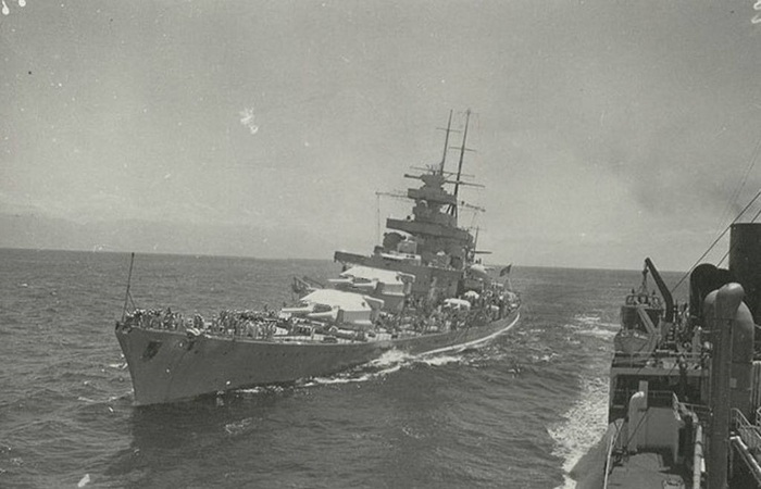 Вид линкора типа «Шарнхорст», при котором становится отчетливо виден его рельефный броневой пояс.