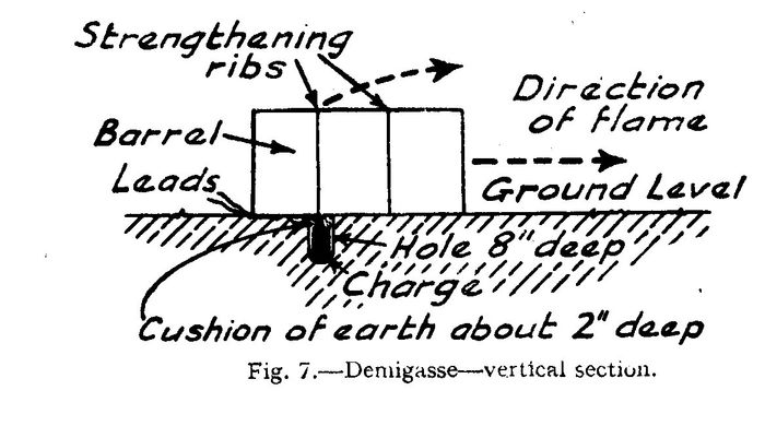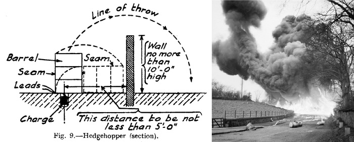 Существовало три основных разновидности британских огневых фугасов – «безопасный фугас» (safe fougasse), «полу-фугас» (demigasse) и «заборный прыгун» (перевод весьма приблизительный; в оригинале- «hedge hopper», hedge- живая изгородь, hopper- прыгун).