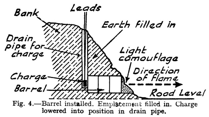 «Безопасный фугас». Road level- уровень дорожного покрытия, Direction of flame- направление выброса пламени, Light camouflage- маскировочный слой, Earth filled in- земляная обсыпка, Leads- провода, Bank- насыпь, склон, вал, Drain pipe for charge- водосточная труба для заряда, Charge- заряд, Barrel- бочка с зажигательной смесью.