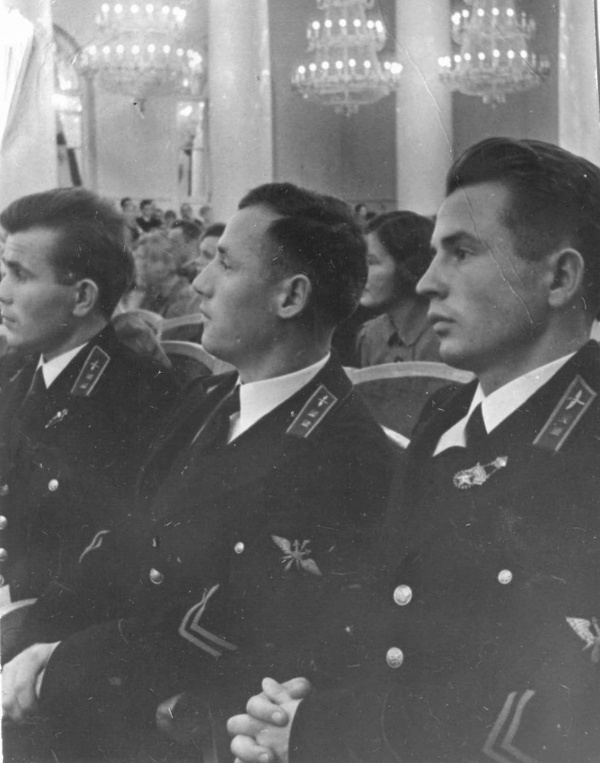 Слева на право: Иван Андреевич Куличев (1920—1979, в 1954 окончил Военно-воздушную академию, генерал-лейтенант, командовал авиацией Сибирского военного округа) , Николай Иванович Пургин (1923—2007, в последствии генерал-майор авиации, заслуженный военный лётчик СССР (1972), кандидат военных наук), Александр Иванович Петров (1917 — 1995, в 1952 году окончил Военно-воздушную академию, работал в ней преподавателем, с января 1973 года гвардии полковник А. И. Петров в запасе, затем в отставке, работал преподавателем военной кафедры 2-го Московского медицинского института имени Пирогова. ), Василий Георгиевич Рязанов, Михаил Петрович Одинцов (1921 — 2011, в последствии заслуженный военный лётчик СССР, генерал-полковник авиации, дважды Герой Советского Союза), Петр Нифонтович Кузнецов (1914—1954, с 1946 года полковник Кузнецов был уволен в запас).
