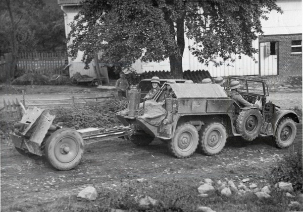 Тягач Sd.Kfz. 7 Немецкого Африканского корпуса (Deutsches Afrikakorps, DAK) с расчетом буксирует 88-мм зенитное орудие Flak 36 во время Тунисской кампании. 1942—1943 гг.