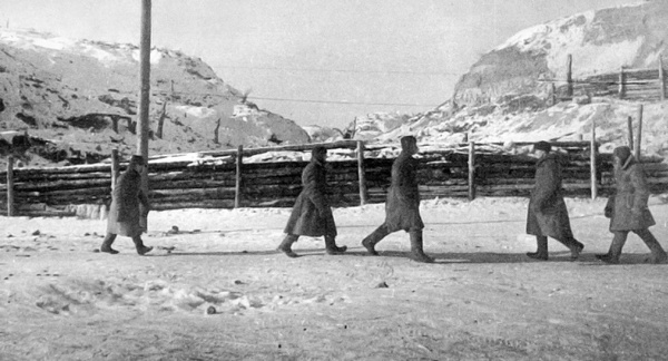 Немецкие военнопленные идут вдоль стены с написанным лозунгом «Мы никогда не капитулируем» («Wir kapitulieren nie»). Южная Германия. апрель 1945