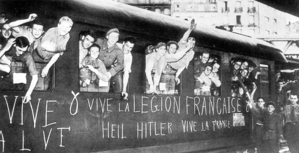 Немецкие солдаты перегоняют трофейный французский многоцелевой транспортер Renault UE с двумя прицепами Renault UK. 1940