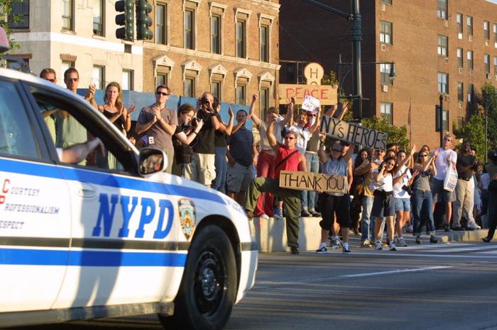 Люди приветствуют проезжающих полицейских в Манхэттене.