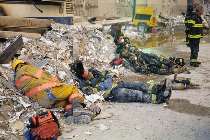 Раннее утро. Пожарные отдыхают в обломках Всемирного торгового центра возле Черч-стрит.