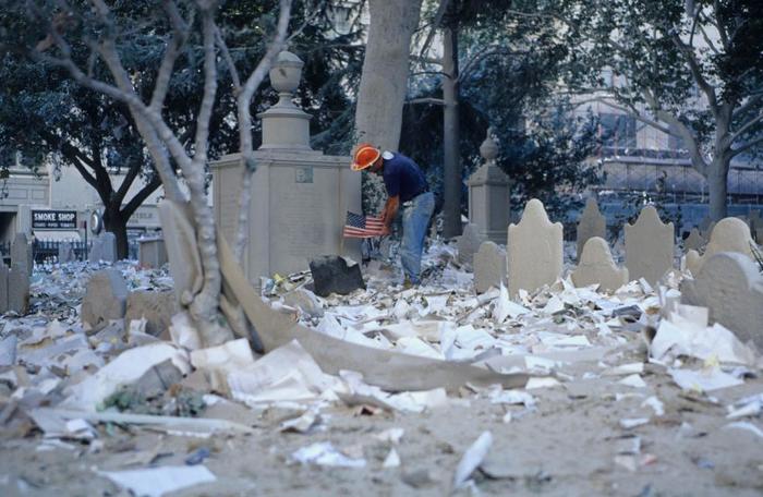Спасатель пытается очистить от пыли американский флаг на кладбище часовни святого Павла.