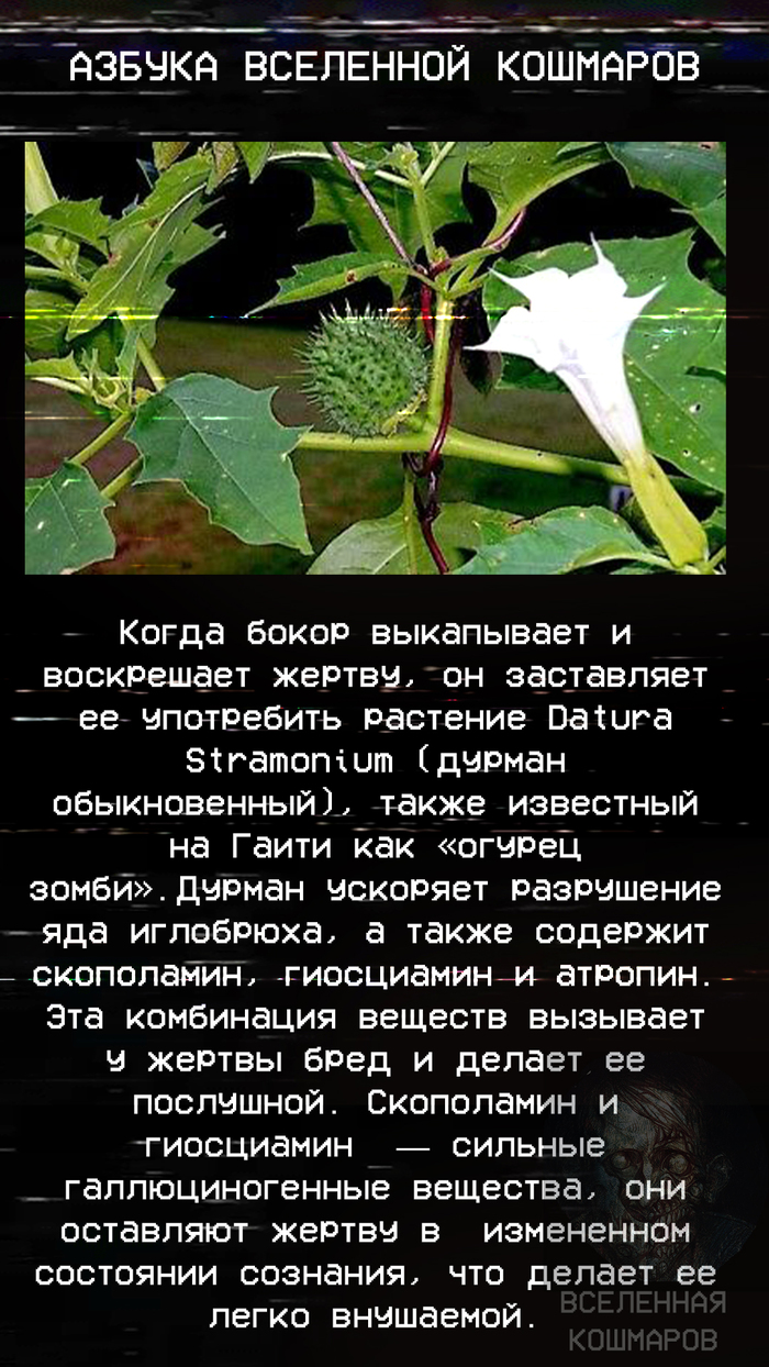 В вуду большую роль играют различные порошки и зелья, которые готовят колдуны. Они помогают как лечить, так и вводить в транс, необходимый для общения с духами. Добавив в порошок тетродотоксин, колдун незаметно распыляет его перед жертвой – вскоре после этого жертва умирает по неизвестным причинам. Но это не смерть, а крайне эффективный паралич, идеально мимикрирующий гибель – смерть жертве лишь снится. По прошествии времени колдун откапывает её и даёт ей пасту из растения datura stramonium (дурман обыкновенный), приводя в чувства. Но человек больше не будет прежним. После пережитого ужаса от погребения заживо и нехватки кислорода, нейроны в его голове отмирают – жертва лишается рассудка. Паста из дурмана поддерживает забвенное состояние полудрёмы наяву. Душа жертвы похищена, а сама она обречена беспрекословно служить колдуну до смерти физической оболочки.