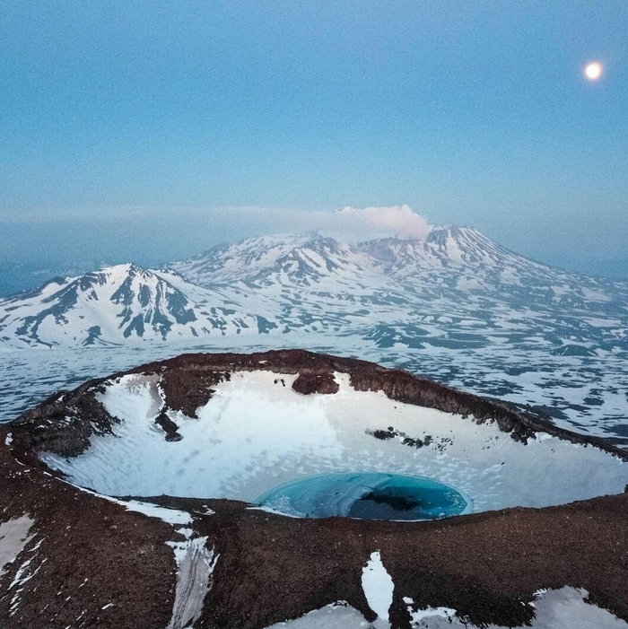 Фото сделано 26 июня, это один из кратеров вулкана Горелый и до середины июля в нем происходит таяние ледника, который образует вот такую красоту
